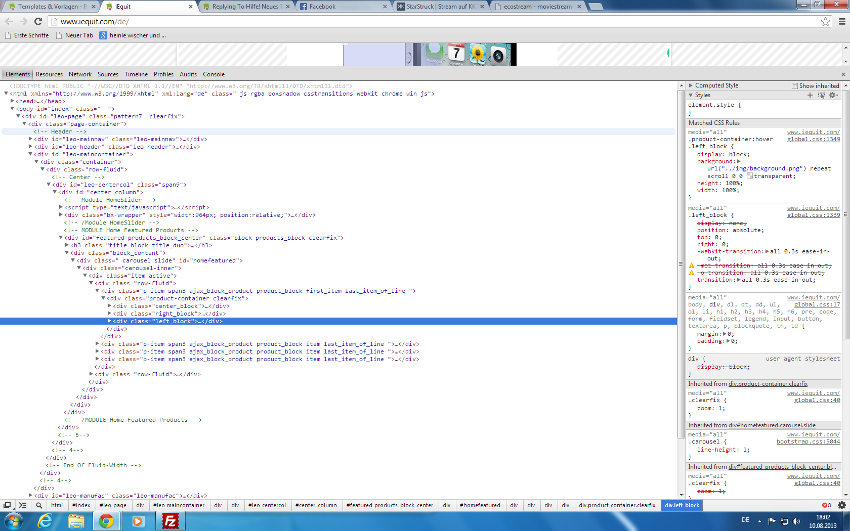 saiufi Posted August 11, 2013 Author Share Posted August 11, 2013 Ich meinte eigentlich nicht, irgendwo hinzuklicken, sondern gezielt auf das 1. Bild in Highlights. Dazu müsstest du durch einen Klick folgenden DIV-Tag öffnen: <div class="center_block">...</div> Denn da ist jeweils der Bild-Link drin. Ich nehme mal an, dass bei dir statt wie im Standard-Template <img width="124" height="124" alt="IPhone 4/4s - Old Cassette Black" src="http://www.DeineWebsite.com/86-home_default/iphone-44s-old-cassette-black.jpg"> so ungefähr Folgendes steht: <img width="124" height="124" alt="IPhone 4/4s - Old Cassette Black" src=http://www.DeineWebsite.com/img/p/1/5/15-home_leoshoe.jpg"> Und das liegt an dieser Anweisung in der /themes/leoshoes/modules/homefeatured.tpl: <img src="{$link->getImageLink($product.link_rewrite, $product.id_image, 'home_leoshoe')}" height="{$homeSize.height}" width="{$homeSize.width}" alt="{$product.name|escape:html:'UTF-8'}" /> Tut mir wirklich leid, aber da musst du schon mal beim Entwickler dieses Templates nachfragen, wie er sich das so denkt. Denn Support für Fremdtemplates würde hier im Forum doch ein bisschen zu weit führen. Viele Grüße eleazar ok trotzdem danke hast du denn eventuell ein theme dass kostenlos ist paarat also das ich im internet downloaden kann, dass auch funktionieren sollte ? :S Link to comment Share on other sites More sharing options...