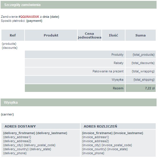 tomekmo Posted August 10, 2013 Share Posted August 10, 2013 Chciałbym w swoim sklepie stworzyć możliwość wysyłania pełnego zestawienia zakupionych produktów wtedy, gdy zaktualizuję zamówienie - dodam za klienta nowe produkty do istniejącego zamówienia. Stworzyłem nowy status "aktualizacja zamówienia" skopiowałem i zmieniłem nazwę szablonu email order_conf, czyli standardowy, który otrzymuje klient po złożeniu zamówienia i klient dostaje e-mail ale nie wypełniony. Przedstawiam wynik w załączniku. Bardzo proszę o podpowiedź co mam zrobić, aby pola wypełniane były automatycznie. Link to comment Share on other sites More sharing options...