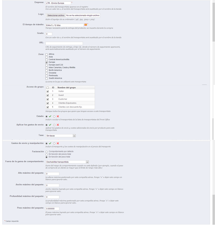 nadie Posted August 11, 2013 Share Posted August 11, 2013 Lo primero de todo. ¿Como tienes los rangos definidos y los precios de los rangos? Adjunto Imágenes que lo vea. ¿Como tienes configurado el transportista? Adjunto Imagenes ¿Como has configurado las zonas? Adjunto Imagenes ¿Lo estados estan bien configurados y enlazados a las zonas? Adjunto Imagenes ¿Supongo que has revisado este tema: http://www.prestasho...-los-impuestos/? ¿no? Ten en cuenta que si quieres gastos de envios "0" para unos países y para otros no a partir de x "rango" , simplemente create zonas distintas y realiza las asignaciones de esas zonas a los Paises y Estados, depende establecer una zona única para todos los países. Link to comment Share on other sites More sharing options...