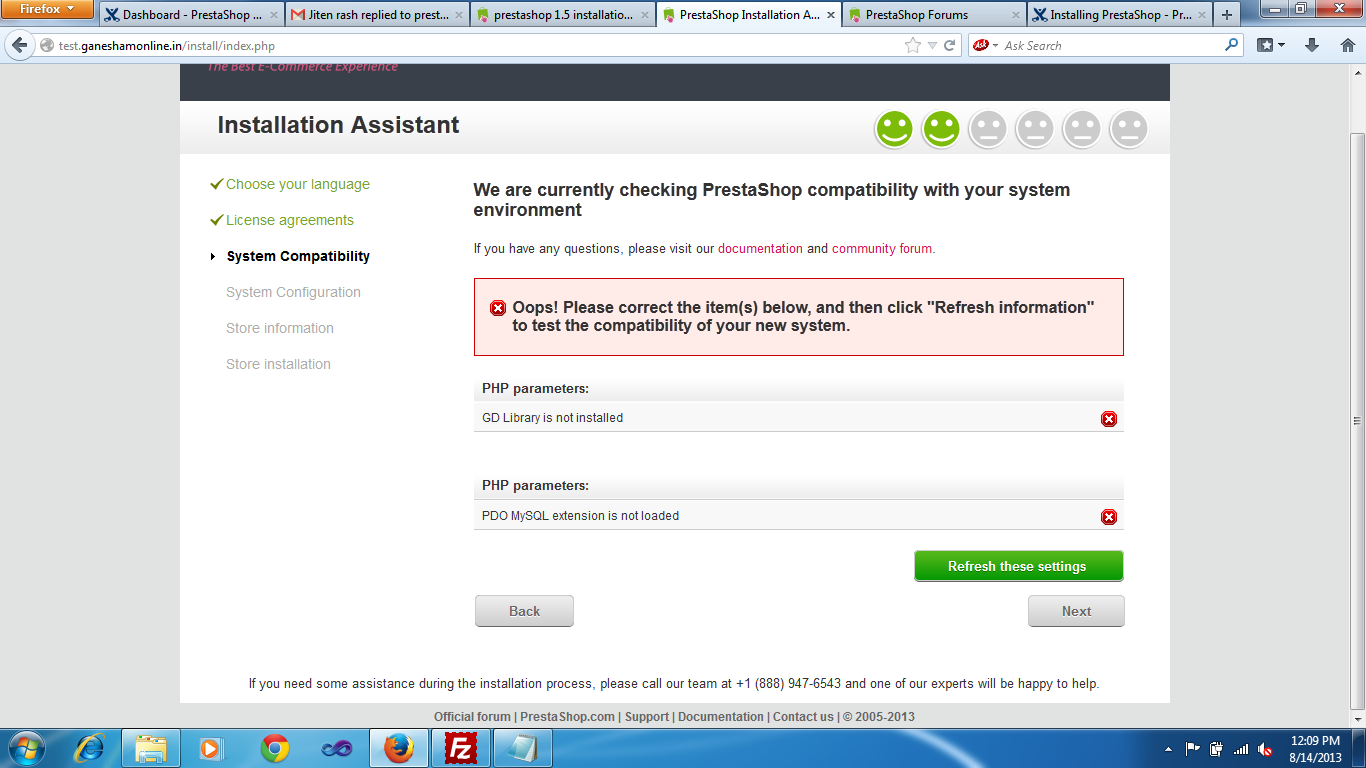 sagar1 Posted August 14, 2013 Share Posted August 14, 2013 (edited) i am installing prestashop 1.5 on server but it showning these error during installation We are currently checking PrestaShop compatibility with your system environment Oops! Please correct the item(s) below, and then click "Refresh information" to test the compatibility of your new system. PHP parameters: GD Library is not installed Recursive write permissions on files and folders: ~/config/ ~/cache/ ~/log/ ~/img/ ~/mails/ ~/modules/ ~/themes/default/lang/ ~/themes/default/cache/ ~/translations/ ~/upload/ ~/download/ ~/sitemap.xml PHP parameters: PDO MySQL extension is not loaded i have uploaded presatshop 1.5.4 version into server wwwroot directory. plz give solution for this how to resolve this problem. Edited August 14, 2013 by sagar1 (see edit history) Link to comment Share on other sites More sharing options...