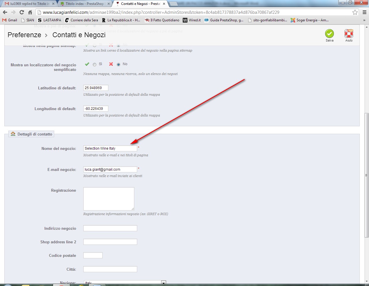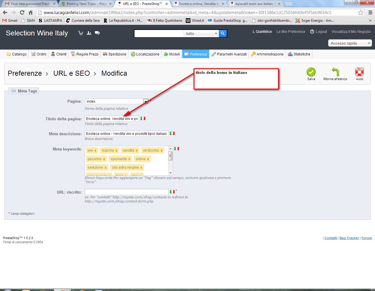 luca.gianf Posted August 14, 2013 Author Share Posted August 14, 2013 Si ho già guardato, li come titolo del negozio c'è "Selection Wine Italy" Non ho proprio idea di come sistemare questa cosa...ed oltre al tag titolo dovrei modificare anche la descrizioni di quella pagina Link to comment Share on other sites More sharing options...