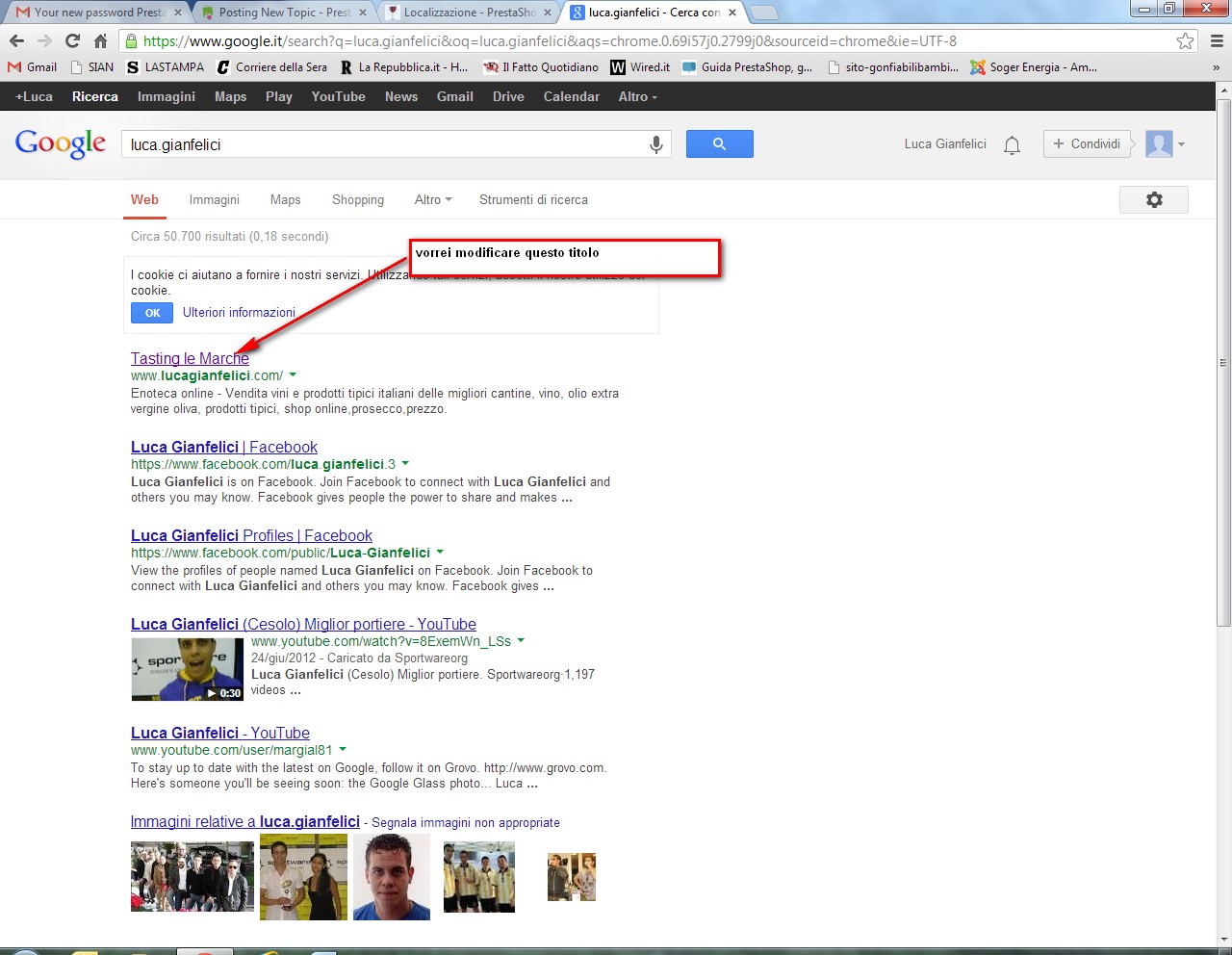 luca.gianf Posted August 14, 2013 Share Posted August 14, 2013 Buongiorno, è da molto che ho questo problema, e visto che non riesco a risolverlo chiedo aiuto a voi; ho un negozio di vendita vini online, ancora inattivo, vorrei sistemare il tag Title che mi compare sui risultati google. é un tag title che avevo inserito al momento dell'installazione, am ora non riesco a capire dove andare per modificarlo. Ho fatto un multilingue,con tre homepage, http://www.lucagianfelici.com/it/ ,http://www.lucagianfelici.com/de/ e http://www.lucagianfelici.com/en/ , e su queste tutto funziona, il problema è sulla index "generale" o "base", cioè su http://www.lucagianfelici.com/ mi c'è un titolo ch enon riesco a modificare (allego immagine) Ho provato anche a modificare la index su URL e SEO ma inutilmente..tra l'altro li c'è la index per le varie lingue, ma non c'è la index base, quella che manda http://www.lucagianfelici.com/ spero che qualcuno mi aiuti.. Grazie Anticipatamente. Luca Link to comment Share on other sites More sharing options...