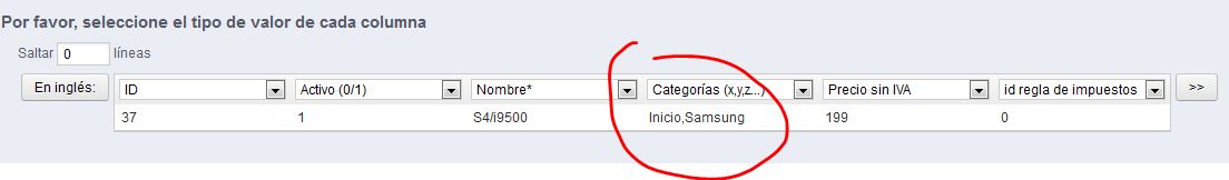 nadie Posted August 14, 2013 Share Posted August 14, 2013 Si probé con id y tampoco, el lio es al separar las categorias por coma que da el error, con espacio tambien, ya nose de que forma decirle que tome las categoria (Inicio,Samsung) ...esto asi no funciona.. alguna idea...??? ¿Me envías acceso total por privado para hacer unas pruebas? (No te preocupes que no te voy a cobrar nada) Te lo miraría ya esta madrugada o mañana por la tarde. Saludos, --- Por cierto de la 1.5.3.1 a la 1.5.4.1, corrigieron muchos errores, conviene pensar en actualizar. Mira a ver si el CSV lo haces como describo aqui: http://www.prestasho...ias-padre-hijo/ El tema de las categorias, en principio segun comento el, las ha podido importar lo que comenta que le falla es que no se le asignan los productos a las categorias que tiene creadas. Link to comment Share on other sites More sharing options...