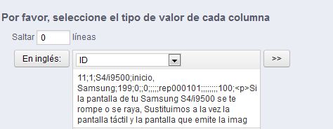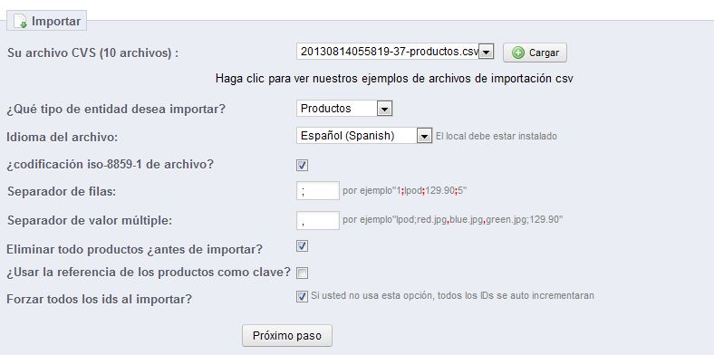 nadie Posted August 15, 2013 Share Posted August 15, 2013 cuando lo separo por comas me hace esto: Vamos a ver, si tu fichero lo estructura de una manera, de esta manera: Nombre Producto | Categorias donde va el producto | Precio Producto de Prueba;Inicio, Samsung; 55 Producto de Prueba 2;Inicio, Samsung; 55 Con comas separas los valores cuando un campo puede tener multiples valores, no todo los valores de las campos se separan con comas, en este caso se separan con coma los campos que pueden tener multiples valores, lo mismo pasa con las imagenes de los productos, que se separan con coma si hay varias imagenes. El separador viene establecido, antes de importar donde dice: Separador de filas: y Separador de valor múltiple: Saludos - Valores unicos con punto y coma Valores multiples con coma. Link to comment Share on other sites More sharing options...