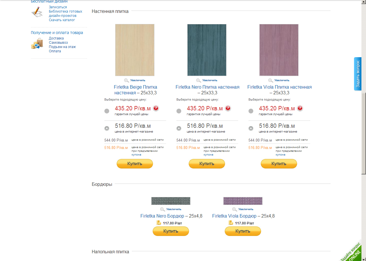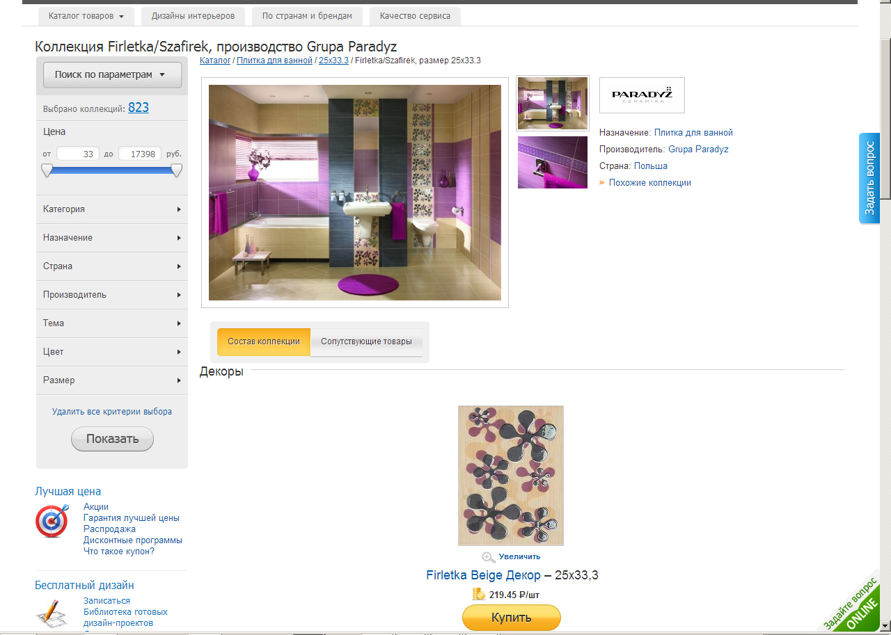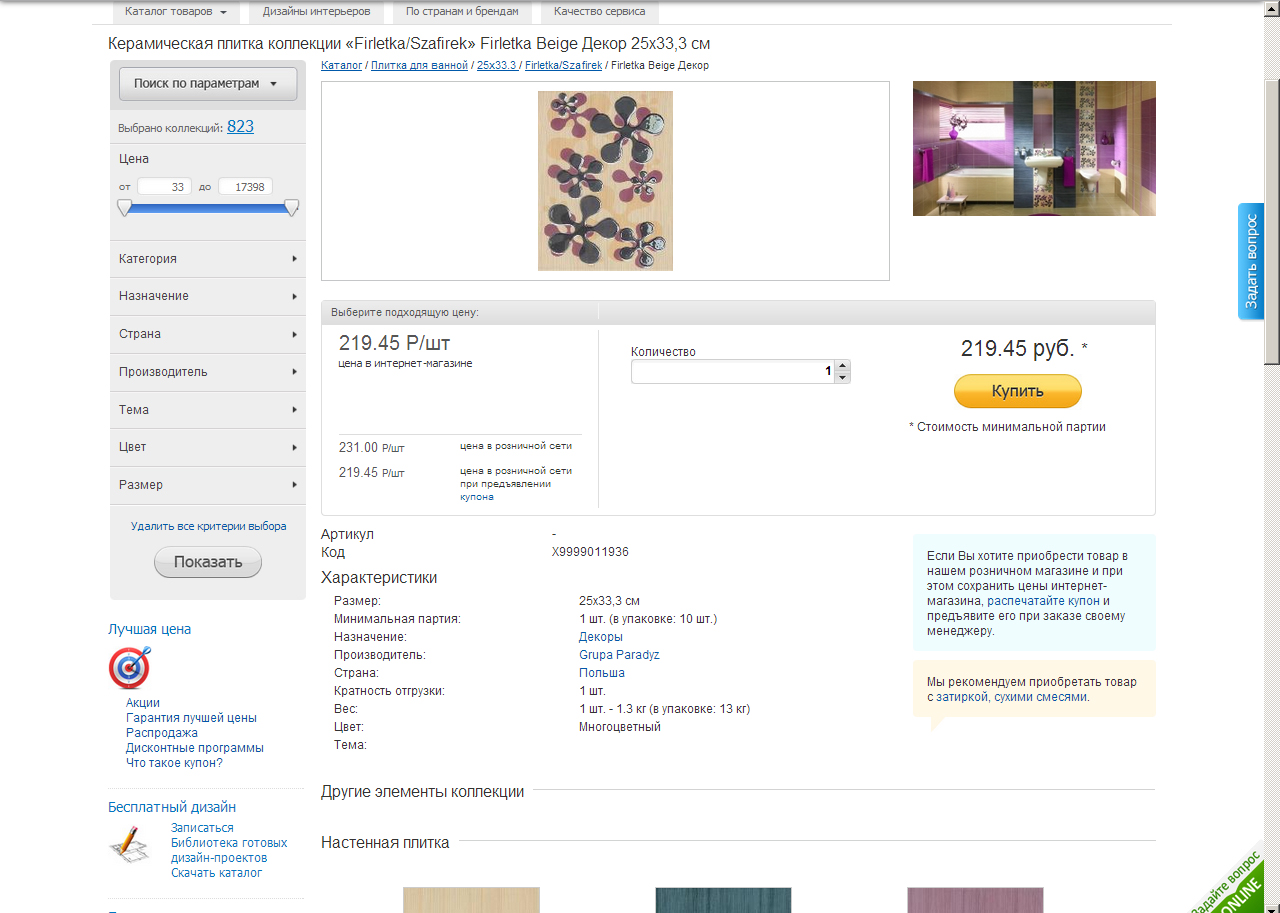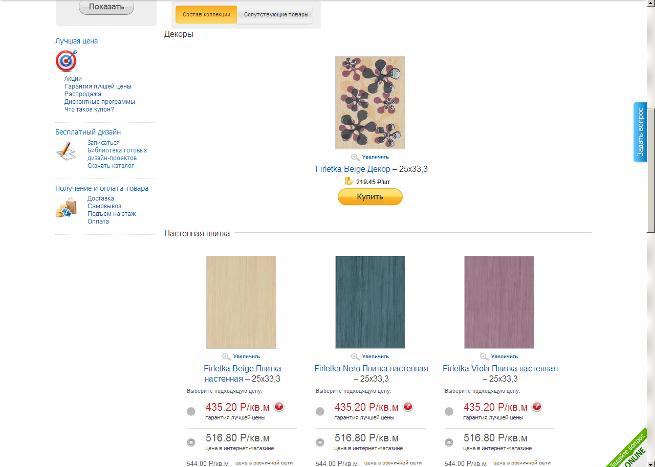 Продажи комплектом не подходит, так как человек знает из какой коллекции у него плитка, а приобрести ему необходимо только бордюр! И копаться во всем скопе элементов коллекции (аксессуаров) , не очень удобно.