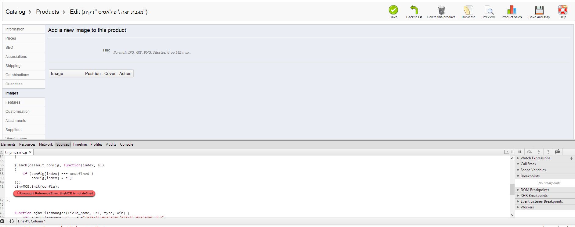 chanansh Posted August 17, 2013 Share Posted August 17, 2013 In the product image edit screen I don't have the controlles. Pressing F12 in chrome shows the error: [color=#FF0000][font=Consolas,]Uncaught ReferenceError: tinyMCE is not defined[/font][/color][color=#FF0000][font=Consolas,] [/font][/color] see attached screen shot Link to comment Share on other sites More sharing options...