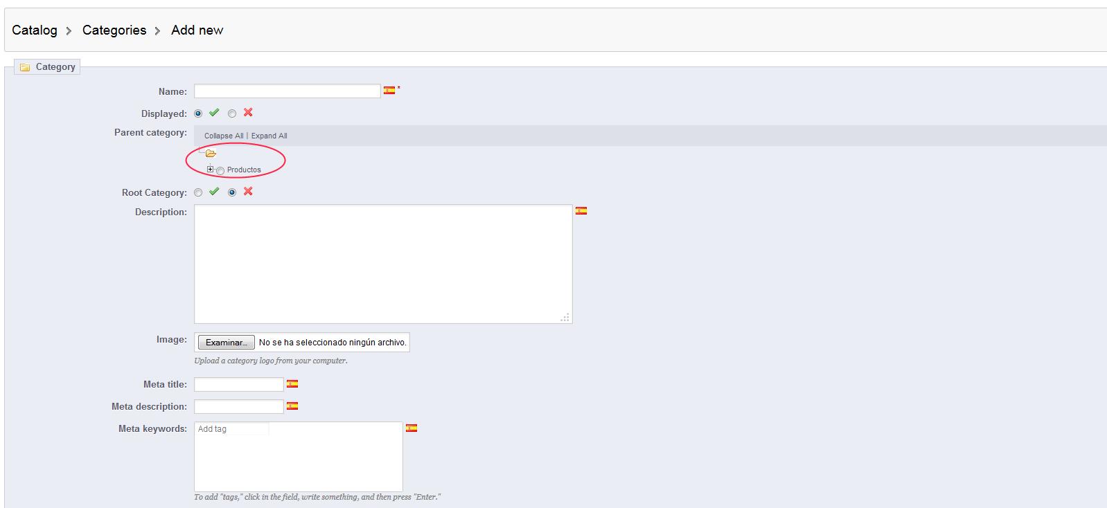 Además si creas una categoría nueva y no marcas la subcategoría "productos" entonces la guarda en BBDD como id_parent=0 y esa categoría no existe.