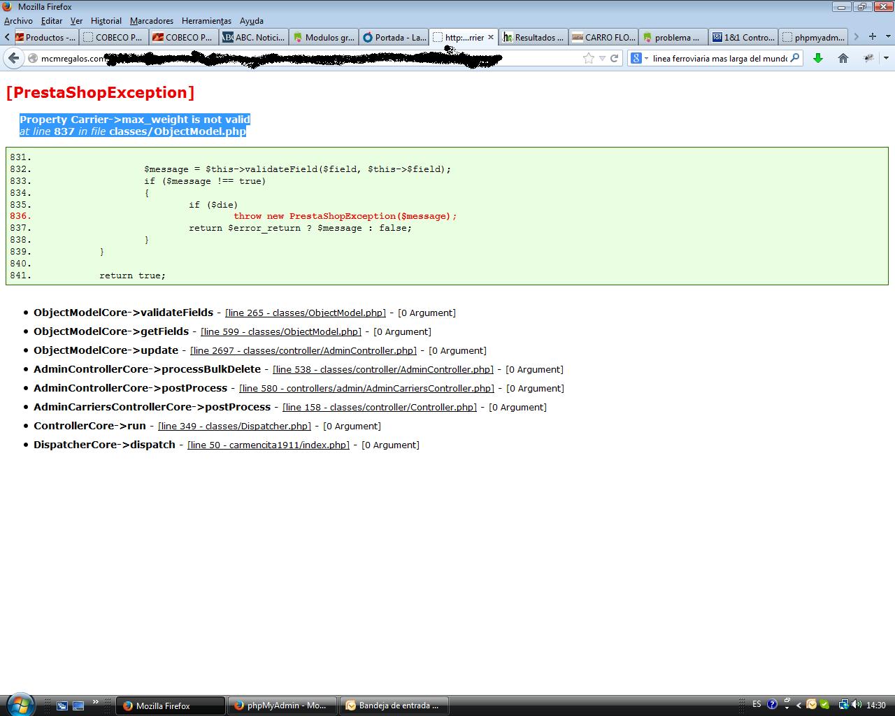 [Solucionado] Property Carrier->max_weight is not valid at line 837 in file classes/ObjectModel.php