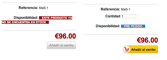 agente_smithx Posted August 23, 2013 Share Posted August 23, 2013 Hola de nuevo. Me gustaría saber si es posible cambiar el color del cajetin de texto en el apartado "Disponibilidad" de un producto. Cuando no hay stock sale en rojo y con el texto "ESTE PRODUCTO YA NO SE ENCUENTRA EN STOCK". Lo que quiero sería, cambiar ese color rojo por otro pero solo cuando está activada la opción admitir pedidos sin stock junto al texto personalizado para dicha opción, manteniendo el color rojo normal de cuando no hay stock. En definitiva, que el cajetin sea rojo en condiciones normales (no poder comprar sin stock) o de otro color cuando este activada la compra con productos sin stock. Adjunto una imagen de como sería. Prestashop 1.5.4.1 Un saludo. Link to comment Share on other sites More sharing options...