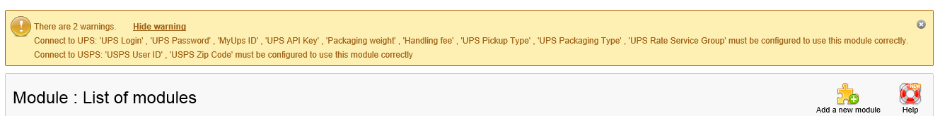 adriesilva Posted August 23, 2013 Share Posted August 23, 2013 Hello, I installed the USPS and UPS module through the front office features. But now I get two warnings. How do I fix this? Thank you in advance. Any and all help is appreciated. Link to comment Share on other sites More sharing options...