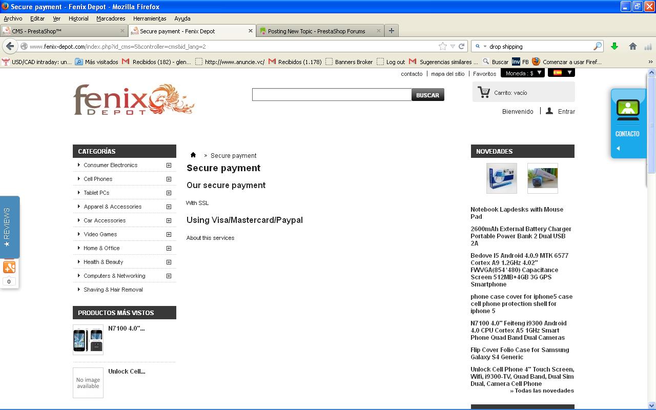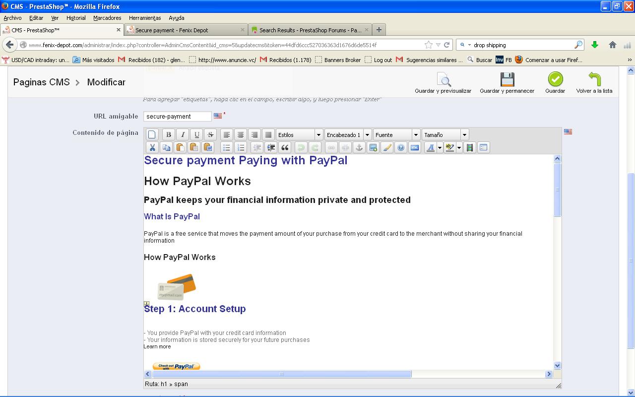 Gmariano Posted August 23, 2013 Share Posted August 23, 2013 (edited) Saludos a todos! Estoy trabajando con la version PrestaShop™ 1.5.4.1 y he configurado los CMS, los he guardado pero al visualizarlos en el frontoffice de la tienda se sigue mostrando la configuracion que trae por defecto en el pago seguro. En delivery he corregido algunos errorer tipograficos y de tiempo. Se guardan pero no se muestran actualizado. Lo mismo me pasa con las actualizaciones de los productos. Esta es un ejemplo de lo que tengo guardado este es el link de mi pagina http://www.fenix-depot.com/index.php ....... y muchas gracias anticipadas por sus colaboraciones Edited October 11, 2013 by Gmariano (see edit history) Link to comment Share on other sites More sharing options...