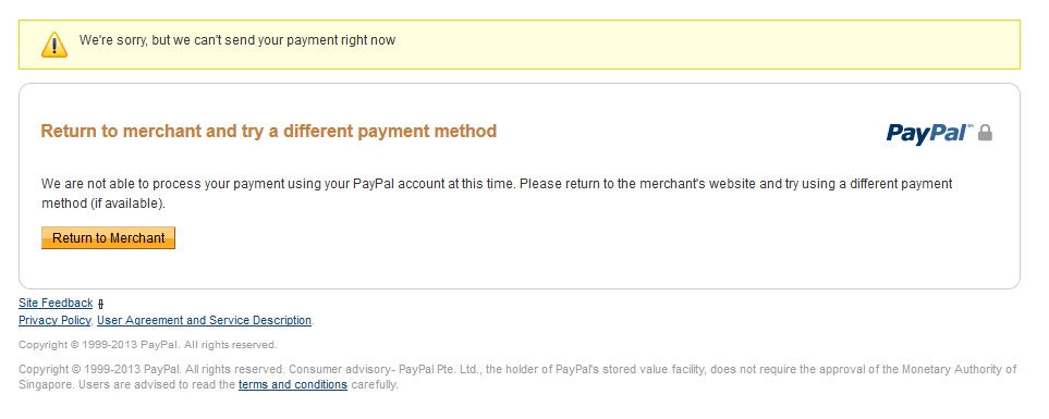 ladivito Posted August 25, 2013 Author Share Posted August 25, 2013 Thank you for contacting PayPal Customer Support. From reading your email, I understand that you are experiencing difficulty in completing your payment to [email protected]. Upon further investigation into your account, I can see that our internal security model has prevented these payment attempts from completing. We use complex statistical models to identify unusual or problematic transaction patterns. This is similar to the way many banks and credit card companies work. There are several reasons why our system has prevented this payment. Please be advised that when the security model blocks a payment, this is not an indication that either party in the transaction is acting in an improper manner. It is merely an indication that the combination of variables in the transaction has alerted PayPal that the potential for failure is high. At this time, the system is disallowing payment in the amount and currency selected to this recipient’s email address, using this funding option. Your current option to complete the payment is as per below: 1. Use a different funding option, 2. Make the payment after 48 hours, or 3. Call us Link to comment Share on other sites More sharing options...