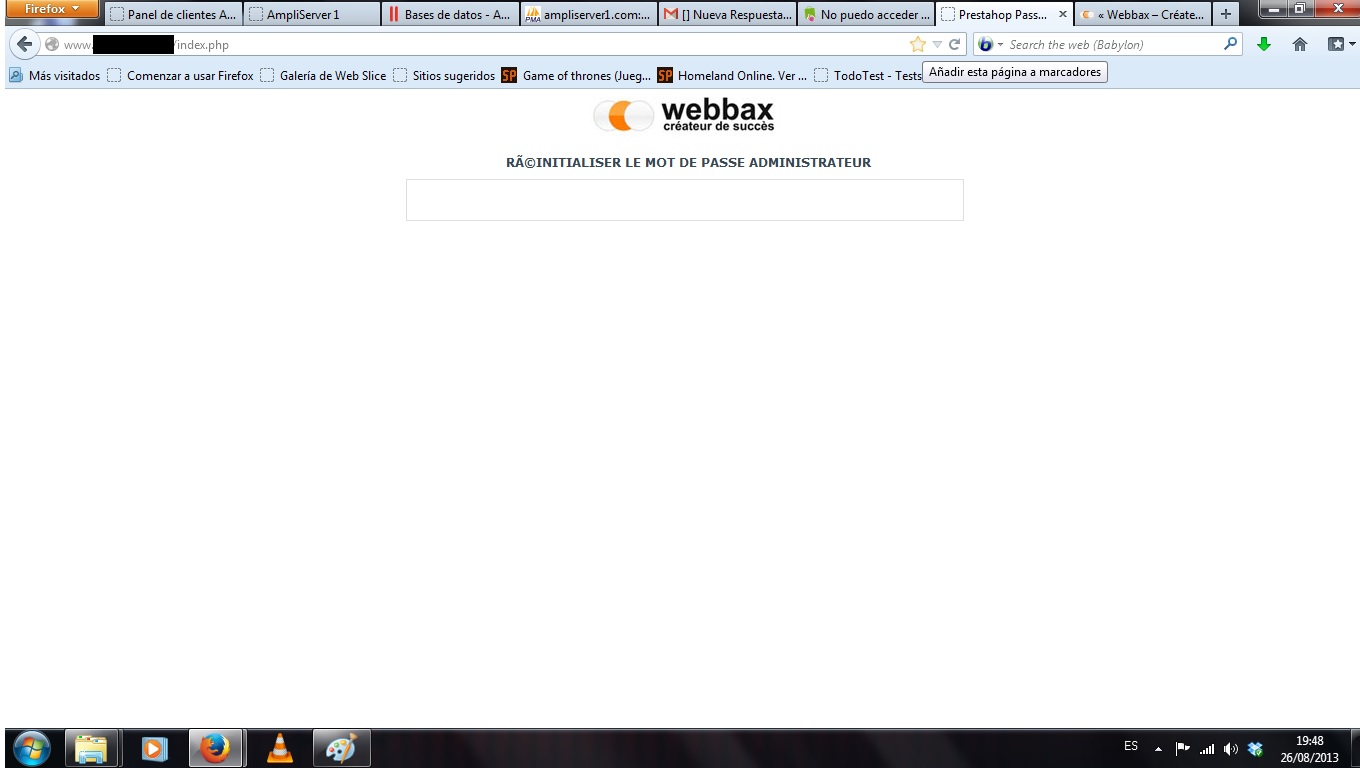 nadie Posted August 26, 2013 Share Posted August 26, 2013 Esta es el pantalla que me aparece al poner el index.php, he revisado el ps_employee en Active en 1. No se que más hacer. Gracias ¿Me puedes pasar la url de tu tienda? Es raro que no te salga la pantalla en el script que has subido. (A mi siempre me ha funcionado) En fin, intenta probar con el método manual antañi: http://www.prestasho...dpost__p__38737 Fichero /config/settings.inc.php , tenéis esta linea ej. define(’COOKIE_KEY‘, ‘stg2lmfgtGTuaK8JA6HjkKD5AHG00wyhcFbBy2tRjMrsFKmRFNEEhFes’); Es la cookie que genera el password para el acceso al BO. Abris vuestro explorer en esta pagina : http://www.md5.fr/ Y copiais el codigo entrecomillado agregando vuestra nueva contraseña ej. stg2lmfgtGTuaK8JA6HjkKD5AHG00wyhcFbBy2tRjMrsFKmRFNEEhFesnuevacontraseña y convertís el codigo en MD5. Abrís vuestra base de datos y en la tabla PS_EMPLOYEE (campo passwd) borrais el antiguo codigo y le pegais el nuevo que habreis obtenido con el MD5, actualizais, cerrais la BD. y accedeis a vuestra tienda con el nuevo PASSWORD GENERADO. 1 Link to comment Share on other sites More sharing options...