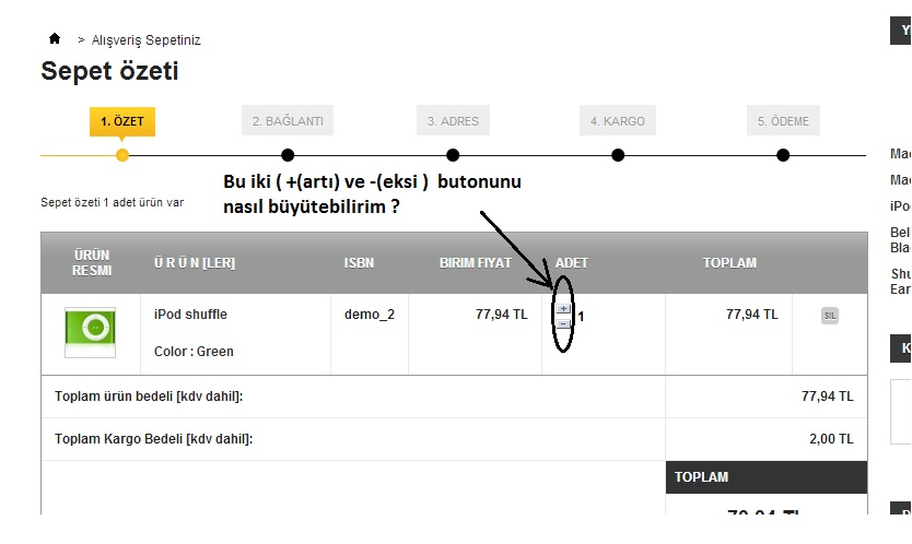 "Sepet Özeti " ekranındaki "+" ve "-" butonunu nasıl büyütebilrim ?