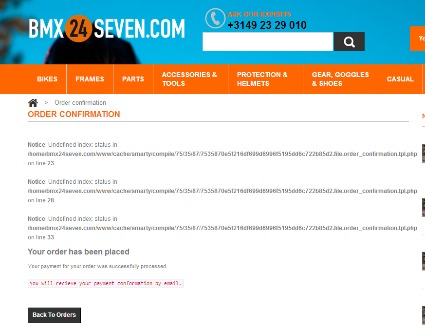WilkoHartung Posted August 27, 2013 Share Posted August 27, 2013 Ik zit met een probleempje, na een betaling met rabobank omnikassa krijg ik de volgende melding in het scherm. De betaling loopt echter wel goed. Notice: Undefined index: status in /home/bmx24seven.com/www/cache/smarty/compile/75/35/87/7535870e5f216df699d6996f5195dd6c722b85d2.file.order_confirmation.tpl.php on line 23 Notice: Undefined index: status in /home/bmx24seven.com/www/cache/smarty/compile/75/35/87/7535870e5f216df699d6996f5195dd6c722b85d2.file.order_confirmation.tpl.php on line 28 Notice: Undefined index: status in /home/bmx24seven.com/www/cache/smarty/compile/75/35/87/7535870e5f216df699d6996f5195dd6c722b85d2.file.order_confirmation.tpl.php on line 33 Weet iemand hoe ik deze meldingen kan verwijderen of hoe ik de oorzaak kan verhelpen? Link to comment Share on other sites More sharing options...