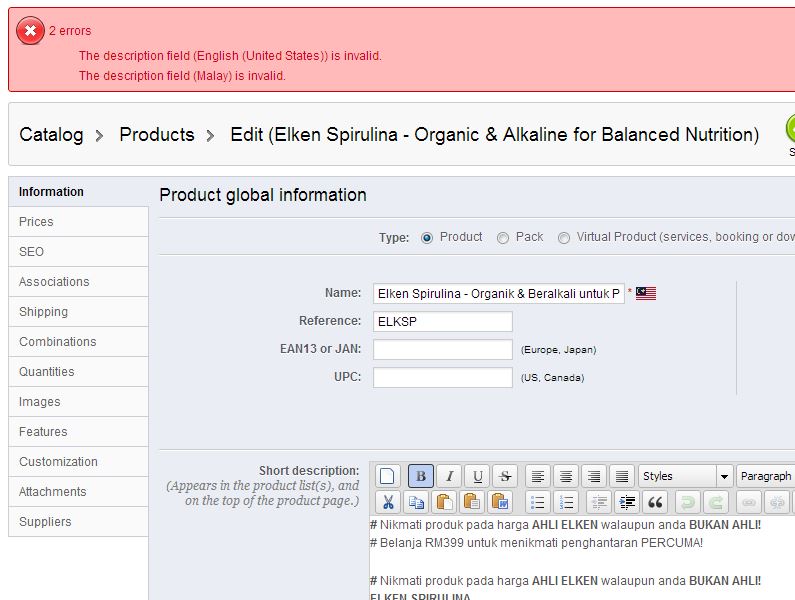 laloq369 Posted September 2, 2013 Author Share Posted September 2, 2013 Hi Patron, I noticed that this happen after i upgrading from 1.4.4 to 1.5.5. I't only happen when i'm trying to update the product. For the new product has no issue. Attach is the screen shot before and after the error. Link to comment Share on other sites More sharing options...