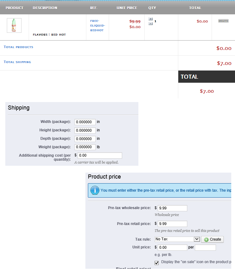adriesilva Posted August 31, 2013 Share Posted August 31, 2013 Hello, I added a product that is free and should not include shipping cost. I don't understand why Prestashop includes a shipping cost of $7 dollars. Is this by default somewhere? I would like to make this free product completely free including shipping, is this possible to do with Prestashop? How? Any and all help is appreciated. I have included pictures of my current back office settings. Link to comment Share on other sites More sharing options...