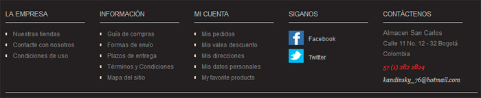 Ivaneare Posted September 11, 2013 Author Share Posted September 11, 2013 Buenas noches desde Colombia, Primero quiero agradecer de antemano toda la colaboración prestada y vengo con una nueva duda Quiero modificar los datos del bloque "Contáctenos" o "Contacte con nosotros" que se encuentra en el footer, adjunto las siguientes imágenes, la primera es como viene por defecto la plantilla y como actualemnte esta en mi sitio:http://sombrerosyponchosdecolombia.com/prestashop/index.php y la segunda es la imagen de como quiero que quede y los datos que quiero que contenga el recuadro. 1. Imagen de como está actualmente (Como viene la plantilla) http://sombrerosyponchosdecolombia.com/prestashop/index.php 2. Imágen de como debe quedar (Según el diseño que implementé) Agradezco su colaboración. Atentamente, Iván Eduardo Arenas V. Link to comment Share on other sites More sharing options...