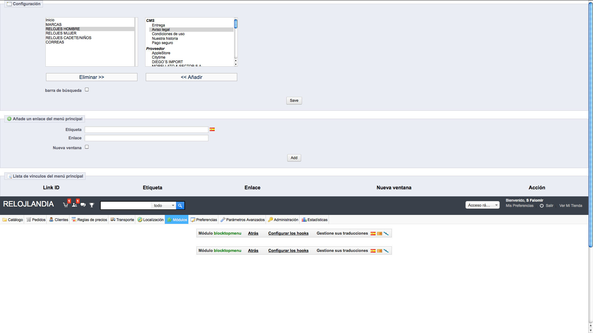 Salvaor Posted September 3, 2013 Share Posted September 3, 2013 (edited) Hola a todos, tengo un problema con el modulo de “menú horizontal superior”, creo que lo toqué hace unas semanas sin tener mucha idea y ahora pasa esto, la parte inferior se encuentra en la superior y la superior en la inferior. No me importaría seguir así si no fuese porque ahora no consigo ni añadir y eliminar categorías y la tienda ya la tengo casi montada. Esto solo afecta al backoffice y concretamente a este modulo (los demás van bien). La versión de prestashop es la 1.5.4.1. Por cierto no soy muy bueno con la informática así que si alguno me da una explicación para “dummies” mejor que mejor, gracias por adelantado! Edited September 4, 2013 by Salvaor (see edit history) Link to comment Share on other sites More sharing options...