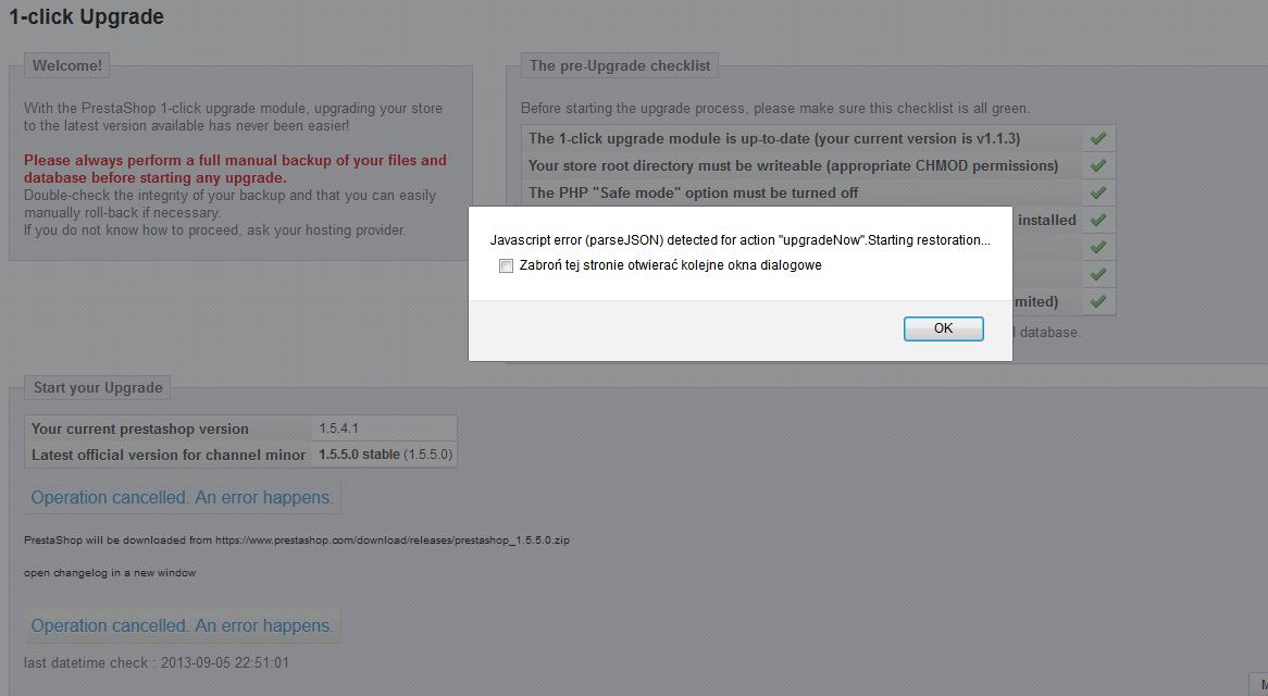 0 PMaster Posted September 7, 2013 Share Posted September 7, 2013 wyrzuca mi taki error, nie za bardzo wiem o co chodzi 1clickupgrade.jpg //eidt od razu mam pytanie czy można upgradowac do 1.5.4 tylko a nie odrazu do 1.5.5? Mam PS 1.5.2 w sklepie Przecież on ma 1.5.4; a też u mnie są błędy przy aktualizacja z tej wersji do nowej. Napisał, że ma wersję 1.5.2 Link to comment Share on other sites More sharing options...