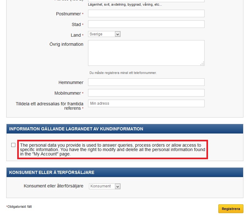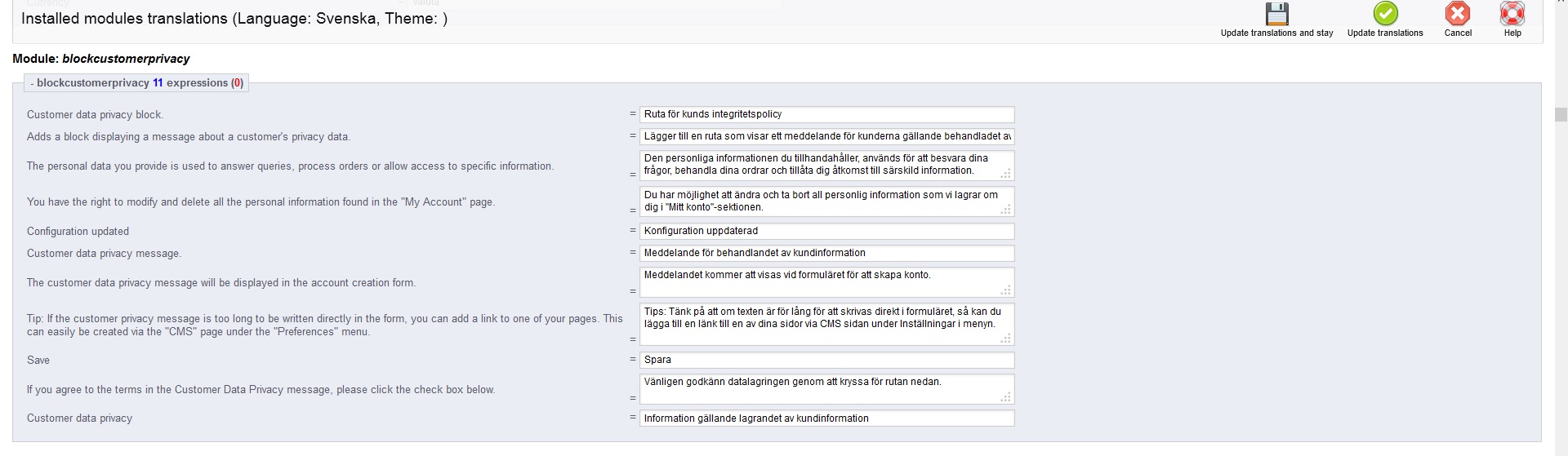 MGLimhamn Posted September 6, 2013 Share Posted September 6, 2013 Hi, I am currently using PrestaShop 1.5.4.1 and I'm using multi-language on my shop and when I try to translate the text to Swedish for customer privacy on the account creation page, it doesn't update it, it stays in English. Here's a picture of what it looks like at the moment in English: The most weird thing is that "Customer data privacy" (the heading) gets translated, but not the message: "The personal data you provide is used to answer queries, process orders or allow access to specific information. You have the right to modify and delete all the personal information found in the "My Account" page." Even though I translated the text for it both theme: core And theme: default (which I'm using) Does anyone know how to fix this? The rest I've translated have been successfully been translated, I think it's only this module. Best regards, MGLimhamn Link to comment Share on other sites More sharing options...