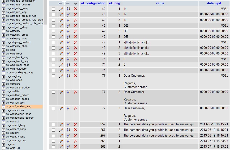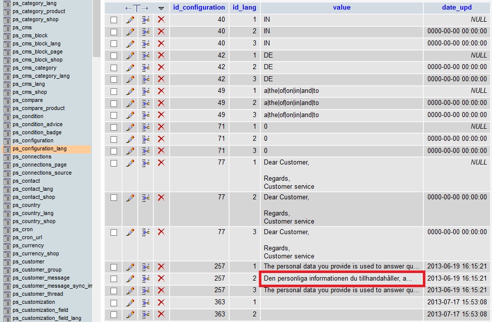 MGLimhamn Posted September 23, 2013 Author Share Posted September 23, 2013 Hi and thank you for helping out. I found out that mine had the id of 257, which is the same id as in the ps_configuration_lang table (see my picture of the table). The only difference between our tables is that I have three 257 because I have languages in my store, which you also can see in the picture. One strange thing is that id_lang 2, which is my Swedish language, is also written in English in the database as you can see. Can I manually translate the text in the database into Swedish or how do we solve this? Link to comment Share on other sites More sharing options...