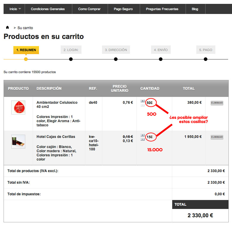tacticas Posted September 6, 2013 Share Posted September 6, 2013 Hola: Quedaría agradecido con vuestra ayuda. Cuando se realiza un pedido, estando ya en el carrito, la casilla de cantidad es para solo 3 cifras, las demás no se ven. En los artículos que tengo en la tienda puede haber pedidos de 20.000, 30.000 ... unidades, por lo que necesitaría que se vieran al menos 5 o 6 cifras. En la ficha del producto ya lo arregle, con información que encontré, pero aquí no se como. Uso el tema default en su versión 1.5.5 Esta es la tienda: http://tienda.exporeclamos.com/ Adjunto una imagen para una visión más gráfica del problema. Link to comment Share on other sites More sharing options...