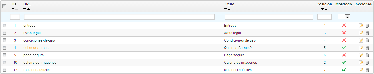 nadie Posted September 10, 2013 Share Posted September 10, 2013 Yo puedo cambiarlas en la columna posición, con las flechas. Adjunto Imagen ¿Que versión de Prestashop usas? A mi me aparecen en la 1.5.5.0. En la 1.5.4.1, había que aplicar este parche: https://github.com/PrestaShop/PrestaShop/commit/453bb826ef2081175700b258b0ca799f3de605f6 porque no aparecían. Link to comment Share on other sites More sharing options...