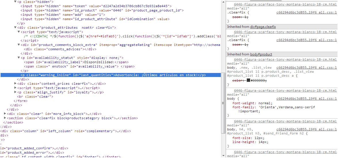 esplug Posted September 10, 2013 Share Posted September 10, 2013 El mensaje de advertencia de poco stock, cómo puedo identificar la hoja de estilo y cambiar el texto que muestra. Adjunto captura del Inspector de Elementos de Chrome. Link to comment Share on other sites More sharing options...