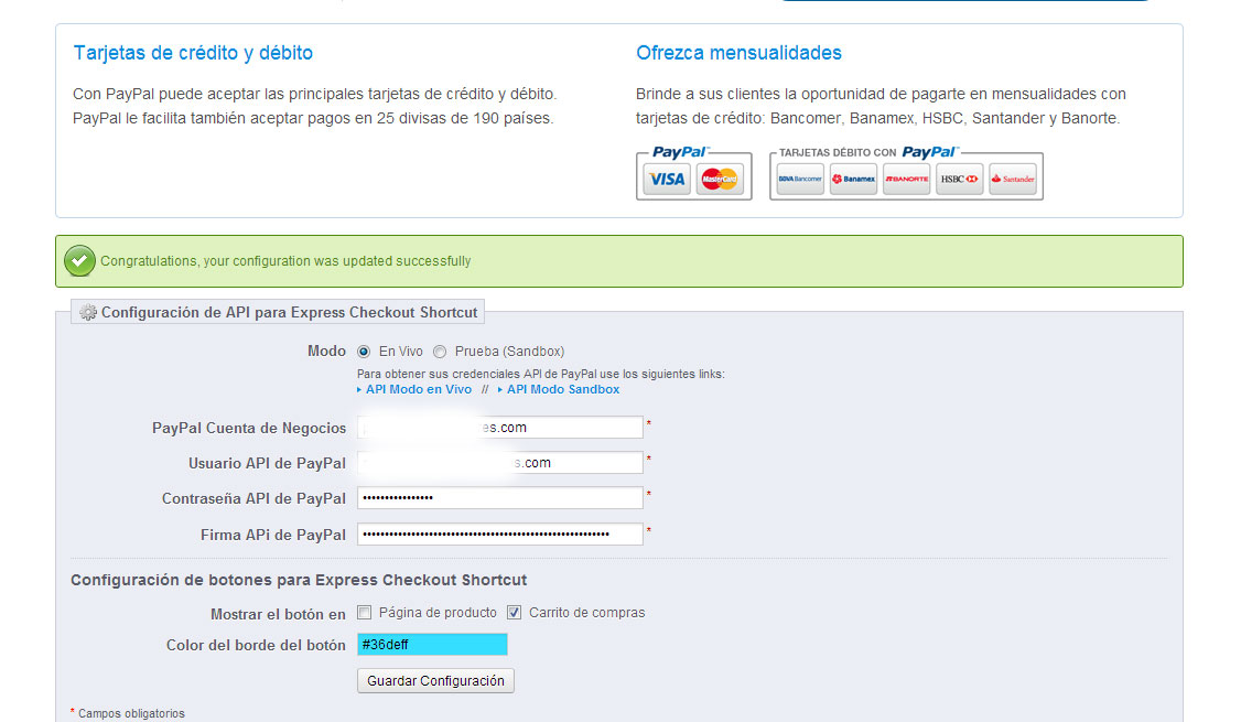 sky2k6 Posted September 11, 2013 Share Posted September 11, 2013 Que tal, Antes que nada un saludo a todos y una brazo para ustedes desde México, bueno resulta que desde que actualice a la versión 1.5.4.1, hice varios cambios y ajustes, en fin la tienda ya esta funcionando con algunos errores, entre los que destacan es que ya no recibo correos cuando se realiza un pedido, no obstante el cliente si los recibe y pues no me apura. Información del servidor Información del servidor: Windows NT build 7601 (Windows Server 2008 R2 Standard Edition Service Pack 1) i586 Versión del software del servidor: Microsoft-IIS/7.5 Versión de PHP: 5.3.15 Limite de memoria: 128M Tiempo máximo de execución: 3000 Información de la Base de DatosVersión de MYSQL: 5.1.56-community Motor de MYSQL: MyISAM Prefijo de las Tablas: ps_ Información de la TiendaVersión de PrestaShop: 1.5.4.1 Bueno el problema que me gustaría me ayudarán es que tuve que actualizar del modulo Paypal USA que tenía al Paypal Mexico que viene ahora, y ya no me aparece mas que Paypal Checkout, veo en las imágenes que debería aparecer opciones, pero yo solo tengo la checkout, les incluyo la imagen del modulo. También, esto me ocasiona un error en el modulo de transferencia bancaria, que ya confirme que es por el modulo Paypal 1.2.5, porque si lo desactivo ya no me aparece el error. Saludos y si necesitan mas información me comentan. Link to comment Share on other sites More sharing options...