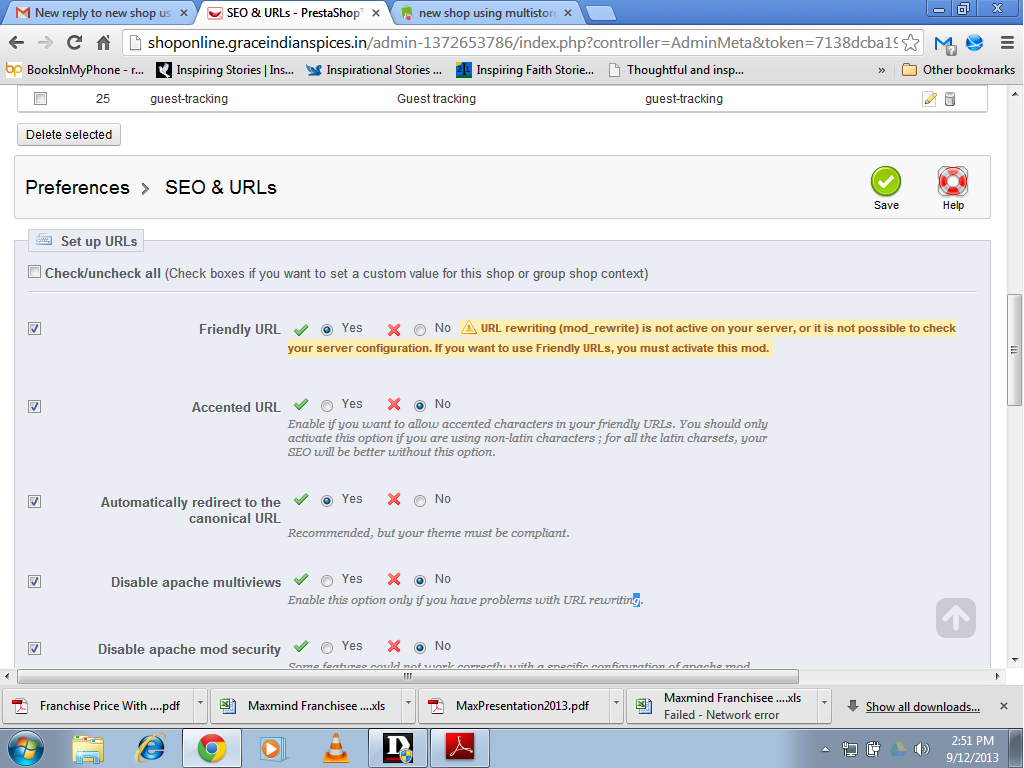 cspaul Posted September 12, 2013 Author Share Posted September 12, 2013 Multistore tree Shop groups list Group Default Group New ID Shop Group Shop Category The shop's main URL Actions 1 GRACE - ET Default Home http://shoponline.graceindianspices.in/ 7 Domestic Default Home http://www.shoponline.graceindianspices.in/domestic/www.shoponline.graceindianspices.in/domestic/ Advanced Parameters Configuration Information View Configuration information This information must be provided when you report an issue on our bug tracker or forum. Information about your configuration. Server information Server information: Linux #3 SMP Tue May 14 11:47:23 CDT 2013 x86_64 Server software version: Apache PHP version: 5.3.27 Memory limit: 256M Max execution time: 30 Database information MySQL version: 5.5.30-30.2 MySQL engine: InnoDB Tables prefix: ps_ Store information PrestaShop version: 1.5.5.0 Shop URL: http://shoponline.graceindianspices.in/ Current theme in use: default Mail configuration Mail method: You are using the PHP mail function. Your information Your web browser: Mozilla/5.0 (Windows NT 6.1) AppleWebKit/537.36 (KHTML, like Gecko) Chrome/29.0.1547.66 Safari/537.36 Check your configuration Required parameters: OK Optional parameters: OK List of changed files Changed/missing files have been detected. Missing files (1) admin-1372653786/autoupgrade/index.php Updated files (39) classes/Hook.php modules/blocknewsletter/mails/index.php modules/blocknewsletter/mails/en/index.php modules/blocknewsletter/mails/en/newsletter_conf.html modules/blocknewsletter/mails/en/newsletter_verif.html modules/blockwishlist/mails/index.php modules/blockwishlist/mails/en/index.php modules/cashondelivery/cashondelivery.php modules/cashondelivery/index.php modules/cashondelivery/logo.png modules/followup/mails/index.php modules/followup/mails/en/index.php modules/mailalerts/mails/index.php modules/mailalerts/mails/en/index.php modules/mailalerts/mails/en/new_order.html modules/referralprogram/mails/index.php modules/referralprogram/mails/en/index.php modules/sendtoafriend/mails/index.php modules/sendtoafriend/mails/en/index.php override/index.php override/classes/index.php override/classes/cache/index.php override/classes/controller/index.php override/classes/db/index.php override/classes/exception/index.php override/classes/helper/index.php override/classes/log/index.php override/classes/module/index.php override/classes/order/index.php override/classes/pdf/index.php override/classes/range/index.php override/classes/shop/index.php override/classes/stock/index.php override/classes/tax/index.php override/classes/webservice/index.php override/controllers/index.php override/controllers/admin/index.php override/controllers/admin/templates/index.php override/controllers/front/index.php Link to comment Share on other sites More sharing options...