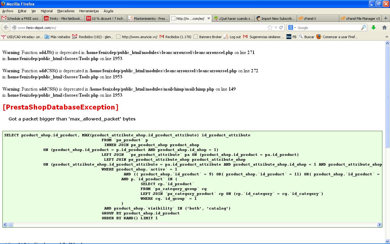 Gmariano Posted September 30, 2013 Author Share Posted September 30, 2013 En relación a el error de prestashop exception he encontrado esto http://forge.prestashop.com/browse/PSCFV-7595 pero la verdad es que nada me ha funcionado, no tengo el modulo Twenga y le desactive el programa de fidelidad, no conseguí nada con esto, me queda actualizar el modulo de fidelidad y me pregunto si algunos de ustedes tendrán una actualización por ahi para probar con eso? Gracias y disculpen las tantas insistencias pero es que este mundo si que es tenebroso como dice nuestro mentor Nadie Link to comment Share on other sites More sharing options...