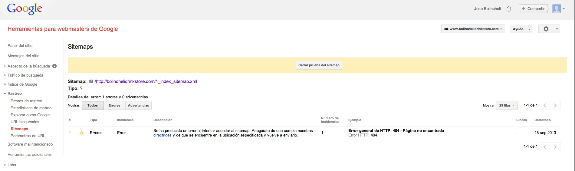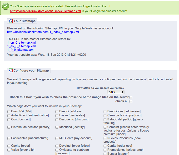 bolincheli Posted September 17, 2013 Share Posted September 17, 2013 Version 1.5.3.1 www.bolinchelidrinkstore.com Hola, hace unos días, cambié los idiomas de mi página, tenia español, catalán y gallego, cambié estos dos últimos por inglés y francés. Ahora al intentar meter el sitemap en google me da un error.Alguien sabe que puede ser? Gracias Link to comment Share on other sites More sharing options...