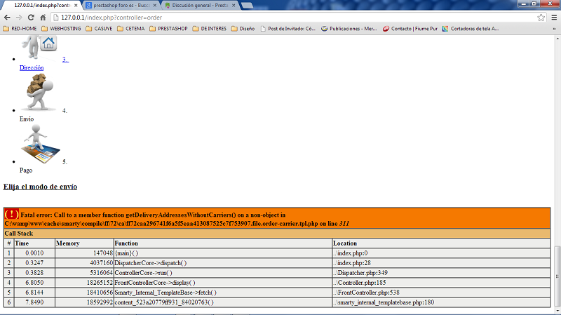 carmadsu Posted September 18, 2013 Share Posted September 18, 2013 (edited) Hola gente Disculpen que los joda, pero ya nose que puede ser, tengo este problema cuando tengo que elegir el medio de transporte en el proceso de compra. pasando la tienda a modo debug muestra cual es el error esta es la linea de codigo que esta asociada al problema {foreach $cart->getDeliveryAddressesWithoutCarriers(true) as $address} Yo no se como solucionarlo, alguien me puede dar una mano para solucionarlo. gracias. saludos Edited September 26, 2013 by carmadsu (see edit history) Link to comment Share on other sites More sharing options...