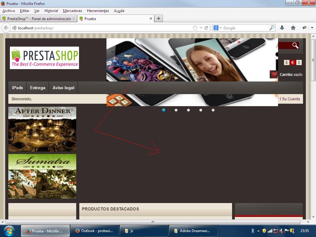nadie Posted September 22, 2013 Share Posted September 22, 2013 Si lo quieres dejar en la pagina principal encima del bloque de productos destacados, tienes que dejarlo en el: displayHome En la primera posición del displayHome. Yo creo que ahora mismo, quizas lo has colocado en el: displayTop y quizas no lo has colocado en la ultima posición del displayTop. (Esto lo puedes ver desde la pestaña Módulos -> Posiciones) Si el slider, te da problemas, usa este directamente: http://www.prestashop.com/forums/topic/194690-free-module-minic-slider-for-ps-15/ --- ¿Veo que lo tienes en local, por lo tanto no es posible ver la web? ¿no? No creo que uses el slider por defecto de Prestashop, ya que ese solo te dejaba colocarlo en la DisplayHome, y si lo querias en el DisplayTop que al parecer parece que es como lo tienes ahora (aunque no podria asegurartelo), tenias que hacer alguna modificación como la comentada aquí: http://mypresta.eu/en/art/tips-and-tricks/how-to-move-image-slider-module-from-home-to-top-in-prestashop.html (http://www.prestashop.com/forums/topic/256941-module-prestashop-homeslider-on-top-free-modification/) Link to comment Share on other sites More sharing options...