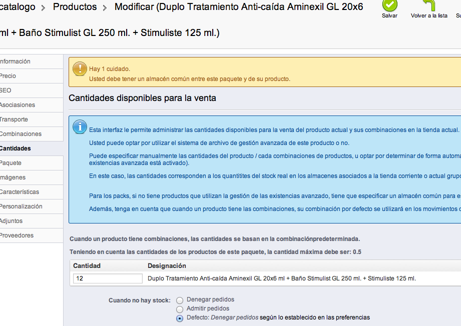 fjguijarro Posted September 21, 2013 Share Posted September 21, 2013 Buenos días. Cuando creo paquetes en PrestaShop, en la tienda aparece que el producto está agotado. En esta dirección podéis ver como el produto está agotado... http://www.kecompro.com/specifique/128-duplo-tratamiento-anti-caida-aminexil-gl-20x6-ml-bano-stimulist-gl-250-ml-stimuliste-125-ml.html ...e incluyo una imagen de la administración donde se puede ver que el paquete tiene cantidad suficiente. En la administración de PresatShop, en la pestaña Cantidades de Producto, sale el siguiente aviso... Hay 1 cuidado. Usted debe tener un almacén común entre este paquete y de su producto. ...que da a entender que tengo que crear un almacén común, pero en la documentación que vengo leyendo y los diferentes ejemplos que encuentro en la red, no veo que nadie indique necesaria esa acción para poder crear paquetes de productos con normalidad. La versión que estoy utilizando es la 1.5.4 . ¿Alguien me puede indicar si está creando paquetes sin un almacén común o como puedo resolver el problema? Muchas gracias por la ayuda. Link to comment Share on other sites More sharing options...
