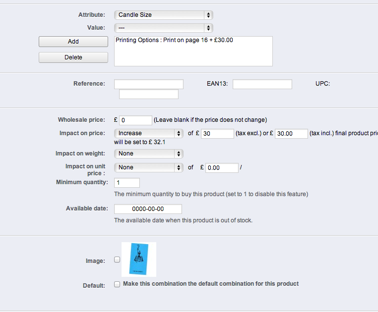 I have a product which is a book on which you can have your name printed. So the Book is £5 and I have a combination of "no printing" which is £0 and "personal printing" which is £30.
