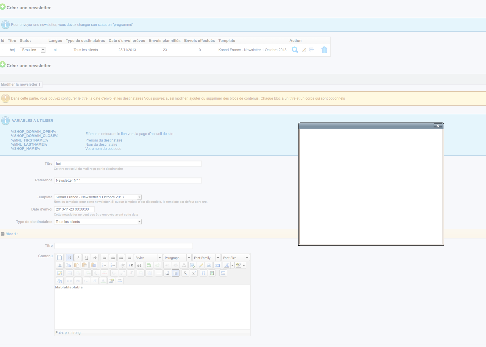 anna_k Posted September 24, 2013 Share Posted September 24, 2013 I already posted this somewhere else in the forum, but i dont think it was the right place so ill repost it here: Hello, i just bought the newsletter and statistics module from addons, and its not working at all. I can not fill it with content . I Can write plain text , but when i click on the insert image button, or html button , or even just trying to change the font color, the box that pops up is just blank. See screenshot. I dont know if im doing something seriously wrong or whats going on, but i need help asap :/ Thanks/ Anna Link to comment Share on other sites More sharing options...