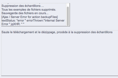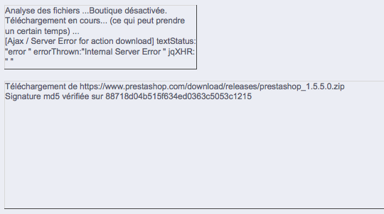 Teenoo Posted September 25, 2013 Author Share Posted September 25, 2013 (edited) Bonjour, l'erreur arrive à une étape différente suivant la procédure. - Pour la procédure mineure c'est suite au téléchargement : - Le log Apache_error : [Wed Sep 25 14:21:36 2013] [notice] Digest: generating secret for digest authentication ... [Wed Sep 25 14:21:36 2013] [notice] Digest: done [Wed Sep 25 14:21:36 2013] [notice] Apache/2.2.22 (Unix) mod_ssl/2.2.22 OpenSSL/0.9.8y DAV/2 PHP/5.4.4 configured -- resuming normal operations - Pour la procédure en répertoire local - Log [Wed Sep 25 14:22:29 2013] [error] [client ::1] client denied by server configuration: /Applications/MAMP/htdocs/.DS_Store [Wed Sep 25 14:22:31 2013] [error] [client ::1] File does not exist: /Applications/MAMP/htdocs/Tuning1/img/logo.jpg, referer: http://localhost:8888/Tuning1/ [Wed Sep 25 14:22:38 2013] [error] [client ::1] File does not exist: /Applications/MAMP/htdocs/Tuning1/img/favicon.ico [Wed Sep 25 14:22:38 2013] [error] [client ::1] File does not exist: /Applications/MAMP/htdocs/Tuning1/img/favicon.ico [Wed Sep 25 14:22:38 2013] [error] [client ::1] File does not exist: /Applications/MAMP/htdocs/Tuning1/img/favicon.ico LOG PHP [25-Sep-2013 12:32:13 UTC] PHP Fatal error: Allowed memory size of 33554432 bytes exhausted (tried to allocate 18682988 bytes) in /Applications/MAMP/htdocs/Tuning1/modules/autoupgrade/classes/Upgrader.php on line 106 [25-Sep-2013 12:33:41 UTC] PHP Warning: scandir(/Applications/MAMP/htdocs/Tuning1/admin8891/autoupgrade/latest/prestashop/img/c/): failed to open dir: No such file or directory in /Applications/MAMP/htdocs/Tuning1/modules/autoupgrade/AdminSelfUpgrade.php on line 1490 [25-Sep-2013 12:33:41 UTC] PHP Warning: scandir(): (errno 2): No such file or directory in /Applications/MAMP/htdocs/Tuning1/modules/autoupgrade/AdminSelfUpgrade.php on line 1490 En espérant que ça puisse permettre un éclaircissement du problème... En tout cas merci de vous pencher sur la question Edited September 25, 2013 by Gregory Roussac (see edit history) Link to comment Share on other sites More sharing options...