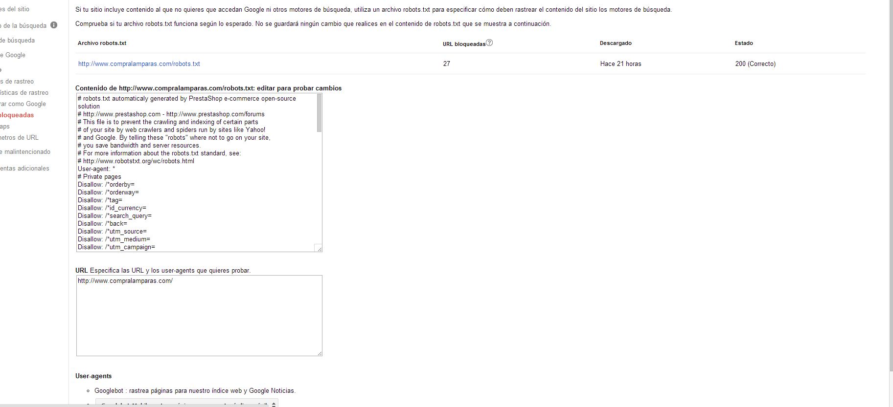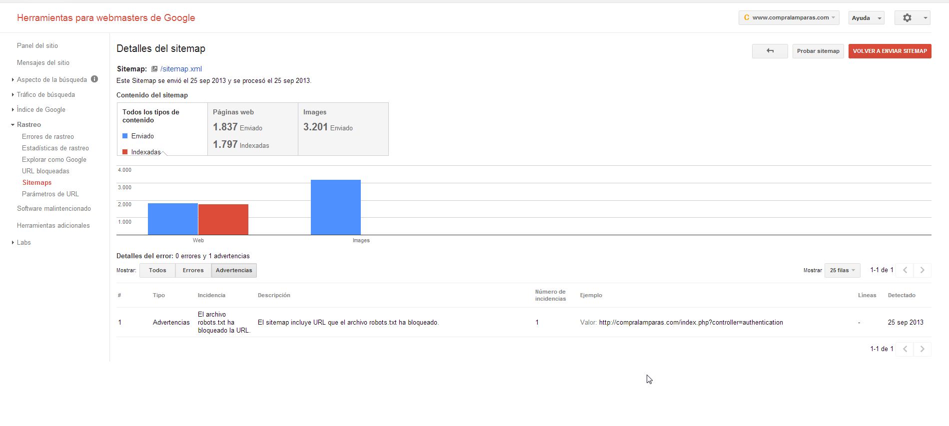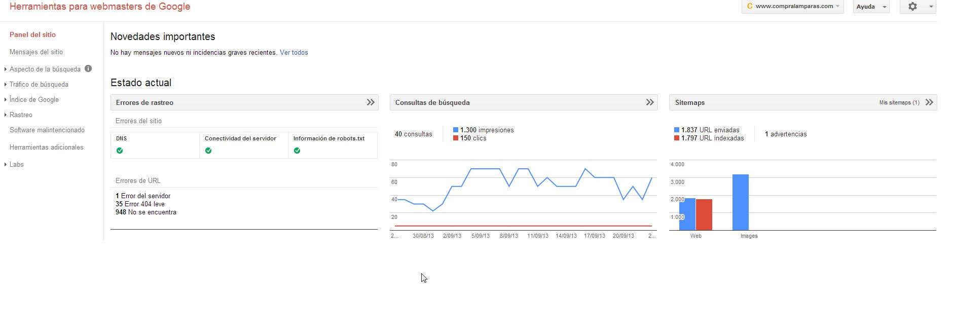jmmartinnu Posted September 26, 2013 Author Share Posted September 26, 2013 Con la información que das es un poco complicado responderte... en que parte de webmaster tools, que es muy grande ? Imagino que es en errores de rastreo, entonces SI que es normal Debes analizar cada web y según lo que veas marcarlo como solucionado o incluso dar de baja tu la web manualmente (Indice de Google - Eliminación de URL) Por ejemplo si es una web de una tercera persona que enlaza con tu tienda y la primera ha cambiado tu le puedes pedir a google que elimine el link. Tienes que detallarnos con un ejemplo que web te aparece y cual es tu web real, por ejemplo, si cambias una categoria de nombre, recientemente has puesto las url amigables o algo así es completamente normal que te salgan errores. El apartado webmaster es como el corte ingles pero el indexador es como correos, lo que uno hace sobre la marcha el otro se toma "su tiempo" Es decir que un cambio en una url hecho hoy puede tardar unas semanas en actualizarse, y claro el enlace anterior dara un 404 porque no existe, especifícanos un ejemplo y te podemos ayudar a ver si te recomendamos paciencia o algo más efectivo Ok, gracias por la información estoy un poco perdido con estos temas de marketing. Adjunto captura de pantalla para que me digas que significa algunas cosas. captura 1 URL bloqueadas captura 2 Los detalles del sitemap ¿Son favorables o que vienen a decir? captura 3 Cuando entro es la primera pantalla que me muestra y me gustaria saber el tema de la grafica que viene a decir de forma resumida. Muchas gracias!! Link to comment Share on other sites More sharing options...