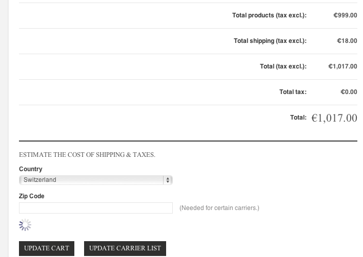 nintropanhauey Posted September 28, 2013 Share Posted September 28, 2013 1. I applied a tax rule for Switzerland. 8% VAT 2. When I go to Cart and select Country: Switzerland and click on UPDATE CART it switches back to default country and no tax is displayed Is the UPDATE CART Button generally not working in prestashop? Has anyone some help how to solve this issue? Thank You Link to comment Share on other sites More sharing options...