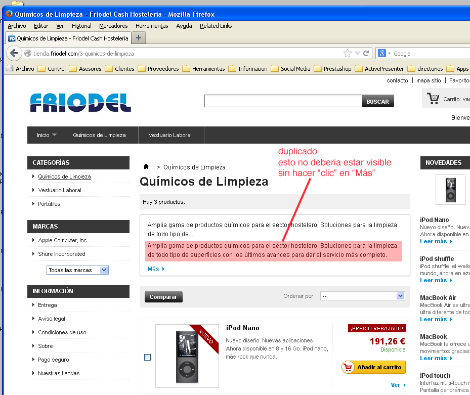 tacticas Posted September 29, 2013 Share Posted September 29, 2013 Hola: Tenia abierta otra consulta de este tema, pero en ese otro caso se trataba de una actualización a v1.5.5. ( http://www.prestashop.com/forums/topic/272141-duplicidad-texto-descripción-de-categor%C3%ADas-después-de-actualizar-a-155/#entry1363026 ) Ahora he realizado una instalación nueva de v1.5.5 y me da el mismo fallo. He modificado el texto de descripción de categorías y me lo duplica. En este enlace podéis ver el fallo en la tienda: http://tienda.friodel.com/3-quimicos-de-limpieza Y en la imagen que adjunto lo que no debería verse hasta que se hiciera "clic" en "Más", pero se ve. Puede alguien ayudarme como solucionar este fallo, ya me ha ocurrido en una actualización a la versión 1.5.5 y ahora en una instalación nueva. Link to comment Share on other sites More sharing options...