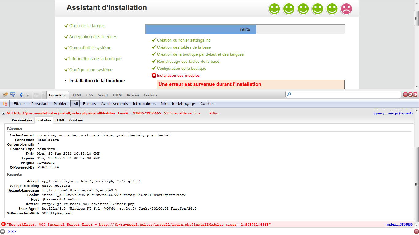 Erreur à 56 pourcents durant l'installation de Prestashop 1.5.5.0