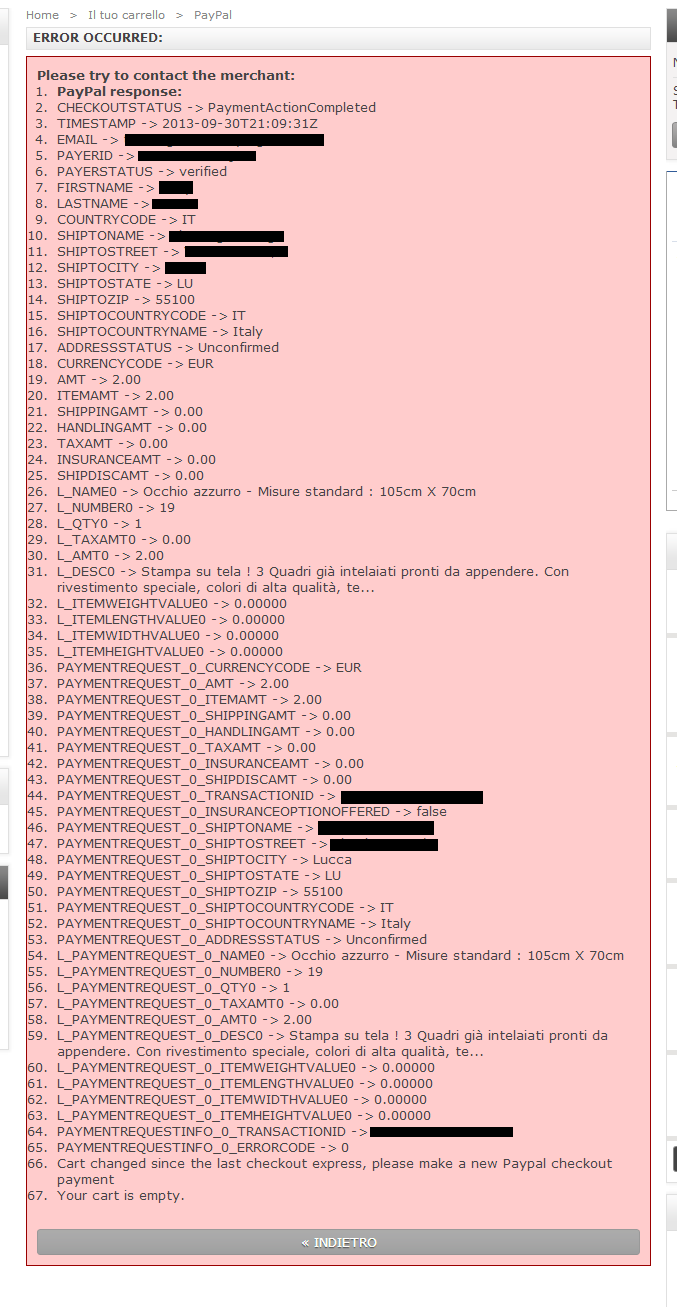 Lu thranga Posted September 30, 2013 Share Posted September 30, 2013 Prestashop v 1.5.4.1 Paypal v 3.6 When i click one page checkout confirm button ,web page take me to paypal.com and then after i click pay butten server error 500 showup .i reloaded the page and then my website open with error message (look attached image) ,Payment received without a problem to my paypal account but showing these errors are the problem. I turned on debug mode and found these errors ,please help me to fix this . Warning: include(/home/anyname/public_html/translations/it/pdf.php): failed to open stream: No such file or directory in /home/anyname/public_html/classes/Translate.php on line 208 Warning: include(): Failed opening '/home/anyname/public_html/translations/it/pdf.php' for inclusion (include_path='.:/usr/lib/php:/usr/local/lib/php') in /home/anyname/public_html/classes/Translate.php on line 208 Fatal error: Allowed memory size of 33554432 bytes exhausted (tried to allocate 8192 bytes) in /home/anyname/public_html/tools/smarty/sysplugins/smarty_internal_templateparser.php on line 519 Is this saying some files are missing ? how can i fix this ? Your help is greatly appreciate. Link to comment Share on other sites More sharing options...