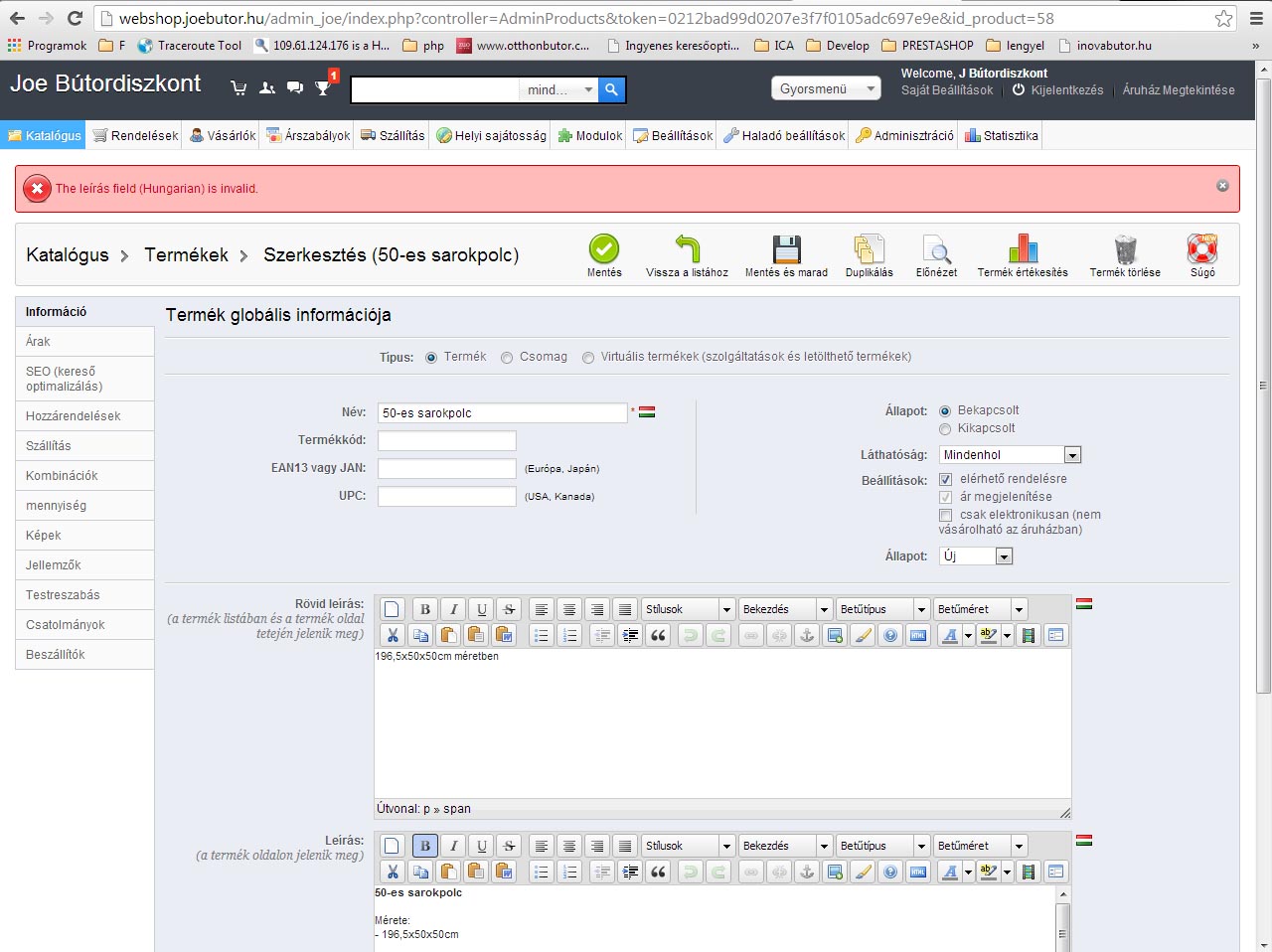 A terméknél a leírás mezőbe szeretnék linket tenni, de visszadob azzal, hogy: