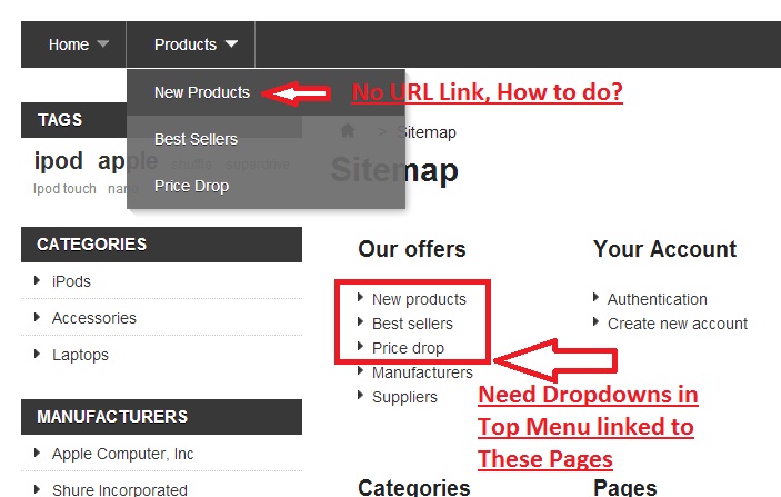 pietpres Posted October 3, 2013 Author Share Posted October 3, 2013 Hi Pascal, I searched for days, but could not find a way to achieve a drop down menu, from the main menu bar, with a URL link. Just before I gave up, i found this absolutely amazing little module from "PRESTALOVE" called "prestalove easy menu". This solved the problem and it is really so easy to work with. All hats off toe prestalove for this module, and the best? IT'S FREE. http://www.prestalove.com/prestashop-modules/easy-menu regards, Piet Link to comment Share on other sites More sharing options...