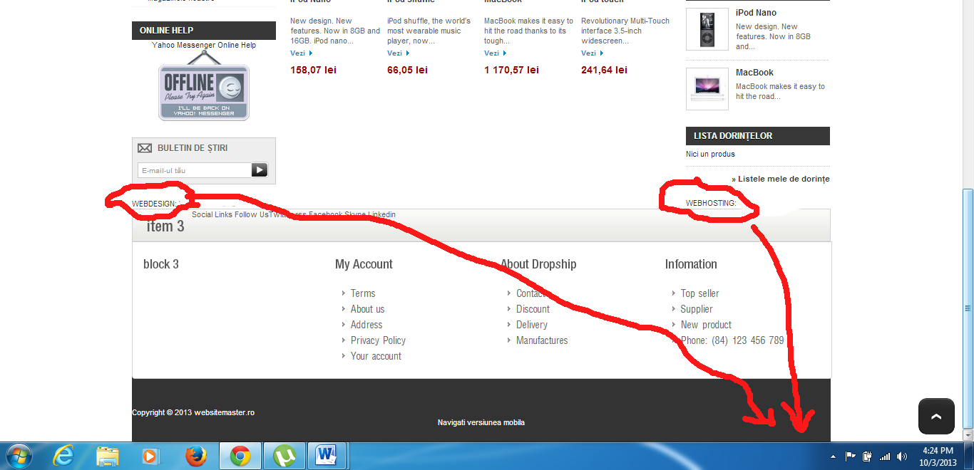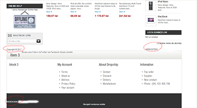 MarianaBalan Posted October 2, 2013 Author Share Posted October 2, 2013 I have tested your solution, but they are not showing as I hoped they will. <div id="right_column" class="column grid_2 omega">{$HOOK_RIGHT_COLUMN}<a href="http://website.com">{l s='SOME LINK RIGHT'}</a></div> This makes my link appear in the right part above my footer module, and the next code makes my link appear in the left side above the footer module, too. <div id="left_column" class="column grid_2 alpha">{$HOOK_LEFT_COLUMN}<a href="http://website.com">{l s='SOME LINK LEFT'}</a></div> The links are working perfectly, just not showing where they are supposed to. Link to comment Share on other sites More sharing options...