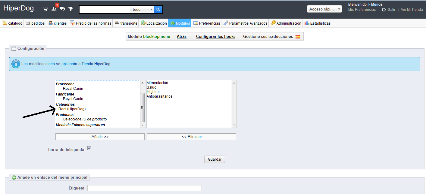 Tengo un problema con el menú superior horizontal. En configuración, en la ventana de la izquierda, donde salen los arboles de los modulos que quires añadir, no me aparecen las categorías, simplemente me pone Categorías --> root(hiperdog).