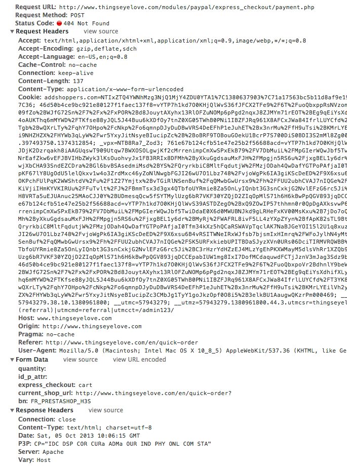 Tayo Posted October 6, 2013 Author Share Posted October 6, 2013 Anybody? Today we have set up a temporary subdomain to see if we can find the cause but we cannot. We set up a complete clean install PS 1.5.5, we did absolutely nothing except added only the Paypal module (3.6 Europe) and we still get the error. You can reproduce this via http://prestashop.thingseyelove.com, click on a product an click on Paypal checkout. Here you get a 404. Anybody give a guess what could be causing this? Link to comment Share on other sites More sharing options...