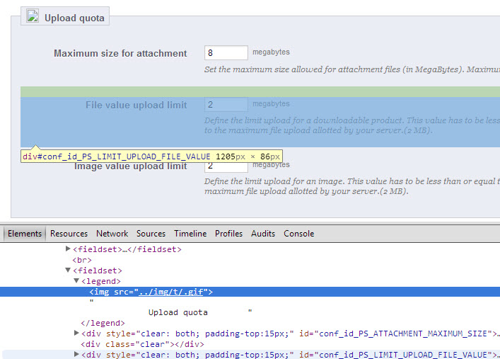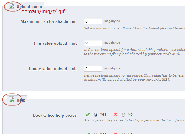 fich Posted October 9, 2013 Author Share Posted October 9, 2013 (edited) yes, I've cheked images folder. there are existsit's look like view .tpl cannot get icon variable from controllerplease see inspect element picture belowthanks for your reply ======== UPDATED ========= when I debug on options.tpl using {print_r($categoryData)} it result Array ( [title] => Upload quota [icon] => tab-preferences [fields] => Array ( [PS_ATTACHMENT_MAXIMUM_SIZE] => Array ( [title] => Maximum size for attachment [desc] => Set the maximum size allowed for attachment files (in MegaBytes). Maximum: 2M [validation] => isInt [cast] => intval [type] => text [suffix] => megabytes [default] => 2 [value] => 8 [is_disabled] => [is_invisible] => [required] => [multishop_default] => ) [PS_LIMIT_UPLOAD_FILE_VALUE] => Array ( [title] => File value upload limit [desc] => Define the limit upload for a downloadable product. This value has to be less than or equal to the maximum file upload allotted by your server.(2 MB). [validation] => isInt [cast] => intval [type] => text [suffix] => megabytes [default] => 1 [value] => 2 [is_disabled] => [is_invisible] => [required] => [multishop_default] => ) [PS_LIMIT_UPLOAD_IMAGE_VALUE] => Array ( [title] => Image value upload limit [desc] => Define the limit upload for an image. This value has to be less than or equal to the maximum file upload allotted by your server.(2 MB). [validation] => isInt [cast] => intval [type] => text [suffix] => megabytes [default] => 1 [value] => 2 [is_disabled] => [is_invisible] => [required] => [multishop_default] => ) ) [image] => ../img/t/.gif [hide_multishop_checkbox] => 1 ) 1 see. $categoryData['image'] = ../img/t/.gifI think it caused by php server configuration, but what? Edited October 9, 2013 by fich (see edit history) Link to comment Share on other sites More sharing options...